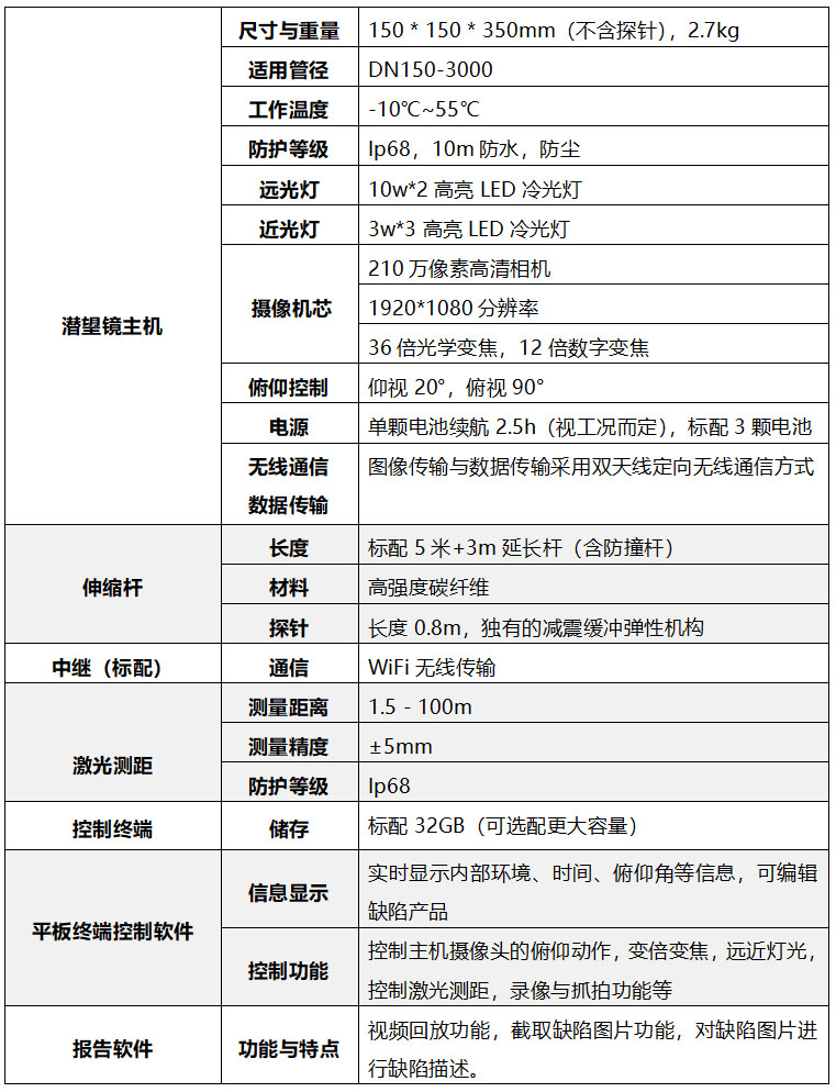 高清無線潛望鏡,主要應(yīng)用于市政管網(wǎng)或工業(yè)容器快速成像檢測,在檢測過程中,通過操作智能控制終端可實(shí)時錄制并保存被檢測對象的內(nèi)部影像,使用者可清晰快速了解到管道內(nèi)部狀況。
